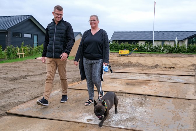 Thomas og Christina Graugaard-Nielsen går tur med hunden Svend på deres byggegrund på Vesterengen i Viuf
